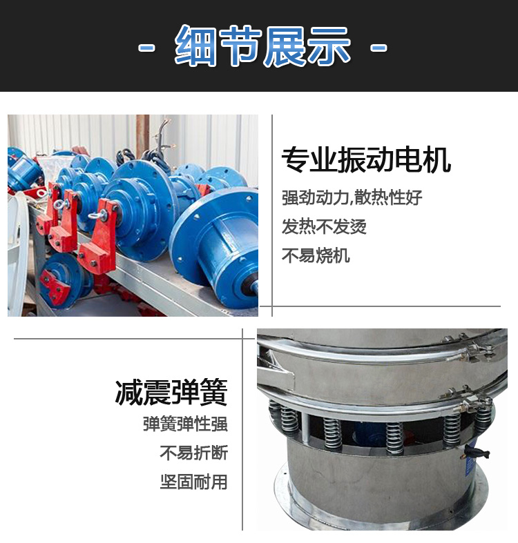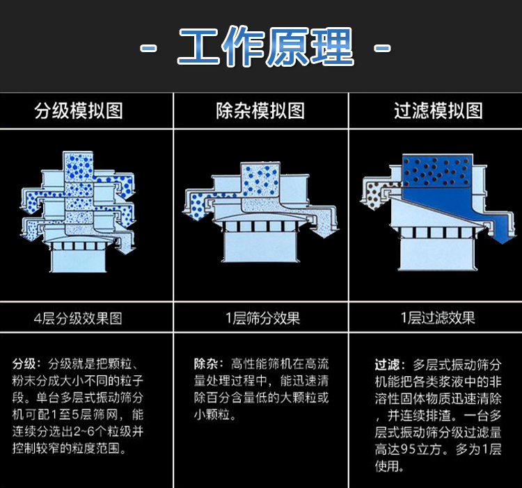 液體涂料振動篩啟動后,其動力裝置,即振動電機上端和下端具有不同相位的偏心塊,由于高速放置而產生復合慣性力。慣性力迫使篩機的振動體作復合旋轉運動,篩架在振動力的作用下作連續往復運動,驅動篩面周期性振動,使篩面上的物料與篩箱作定向跳躍式運動,在此期間,小于篩網表面孔徑的材料通過篩孔下降到下層,成為篩下物。大于篩面孔徑的物料在連續跳躍運動后從出料口排出,最終完成篩分工作。